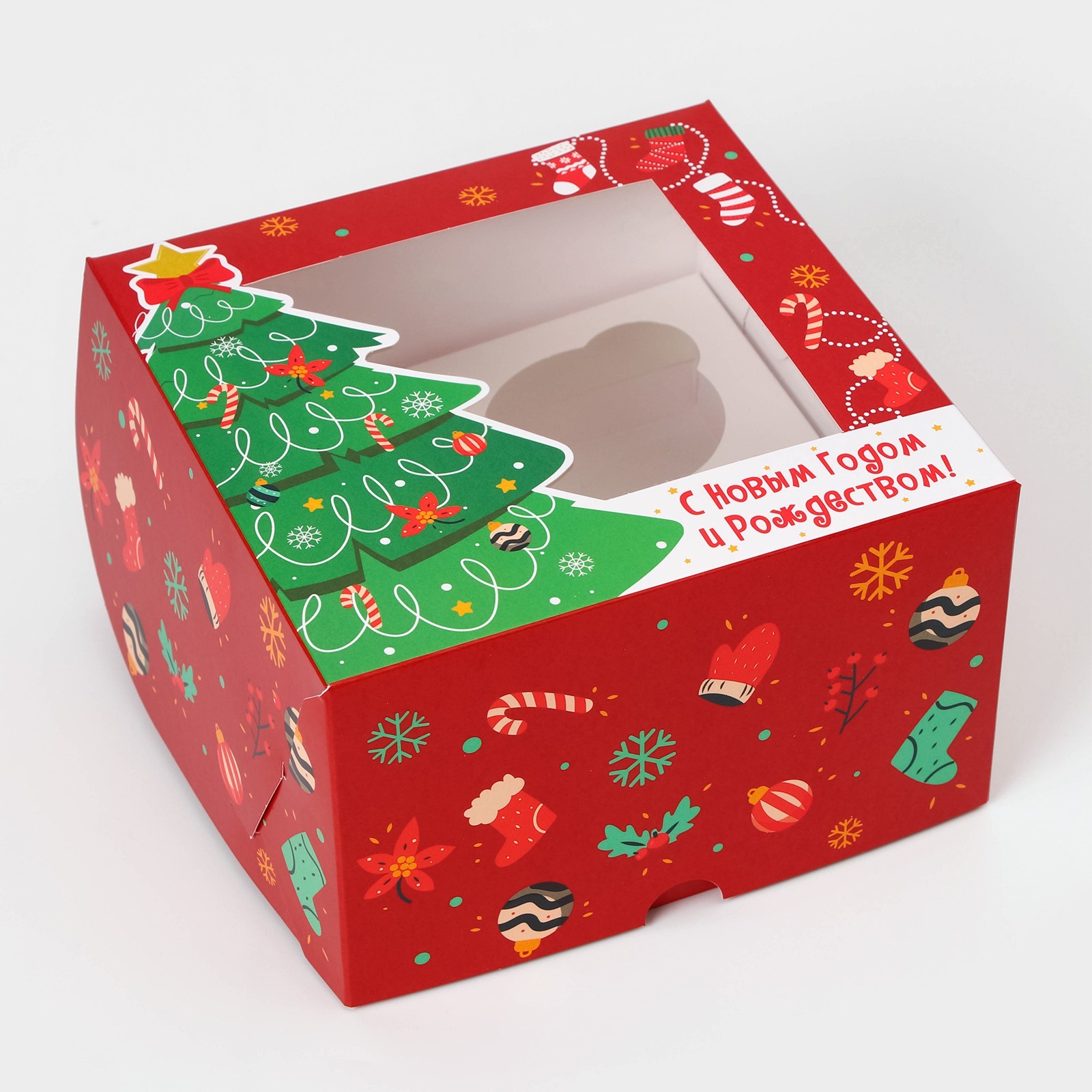 Коробка для 4 капкейков НОВОГОДНЯЯ "С Новым годом и рождеством" Праздничная ель 160х160х100 10686385 - Dolphin HoReCa