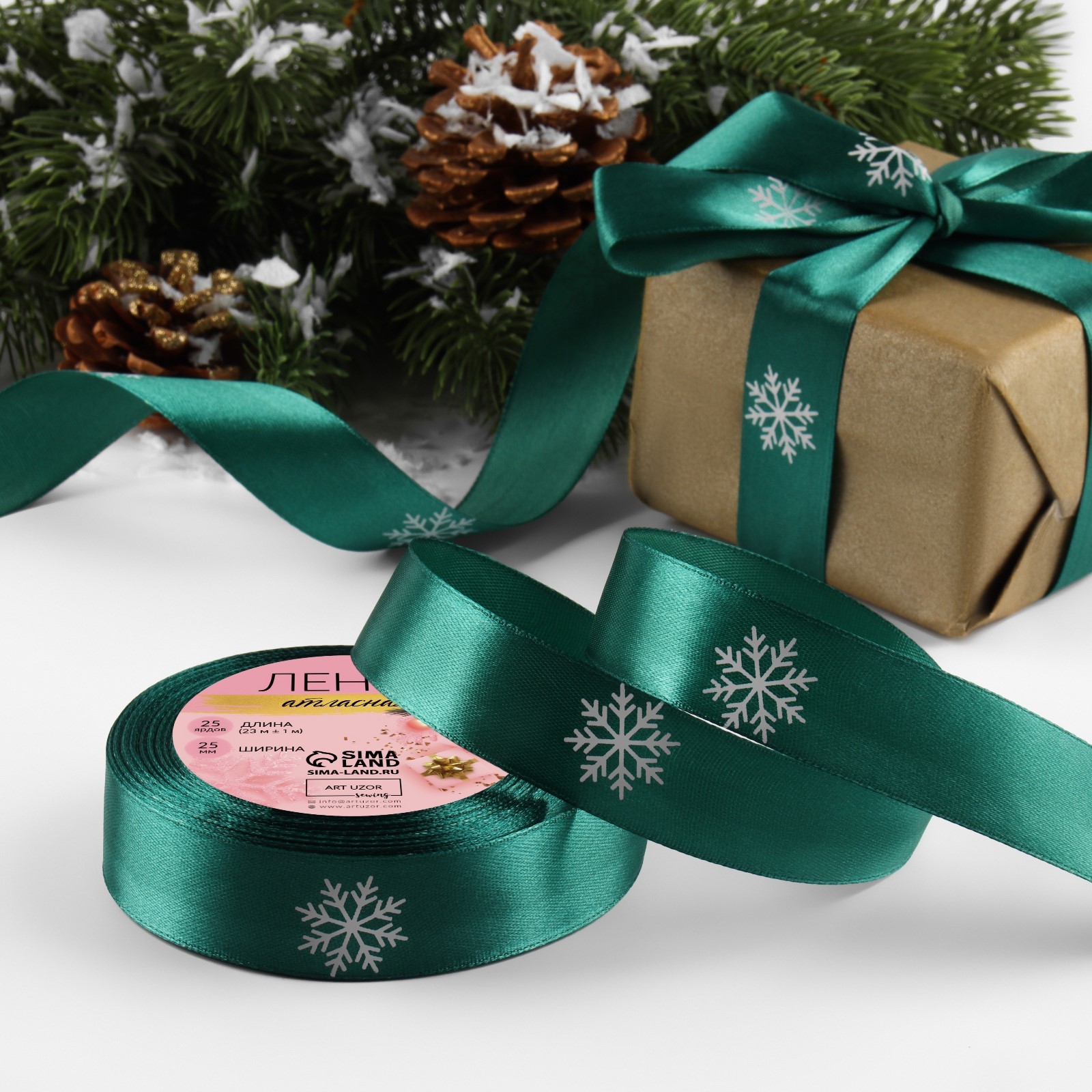 Лента атласная 25мм*25м Снежинки №056 зеленый/белый 7706139 - Dolphin HoReCa