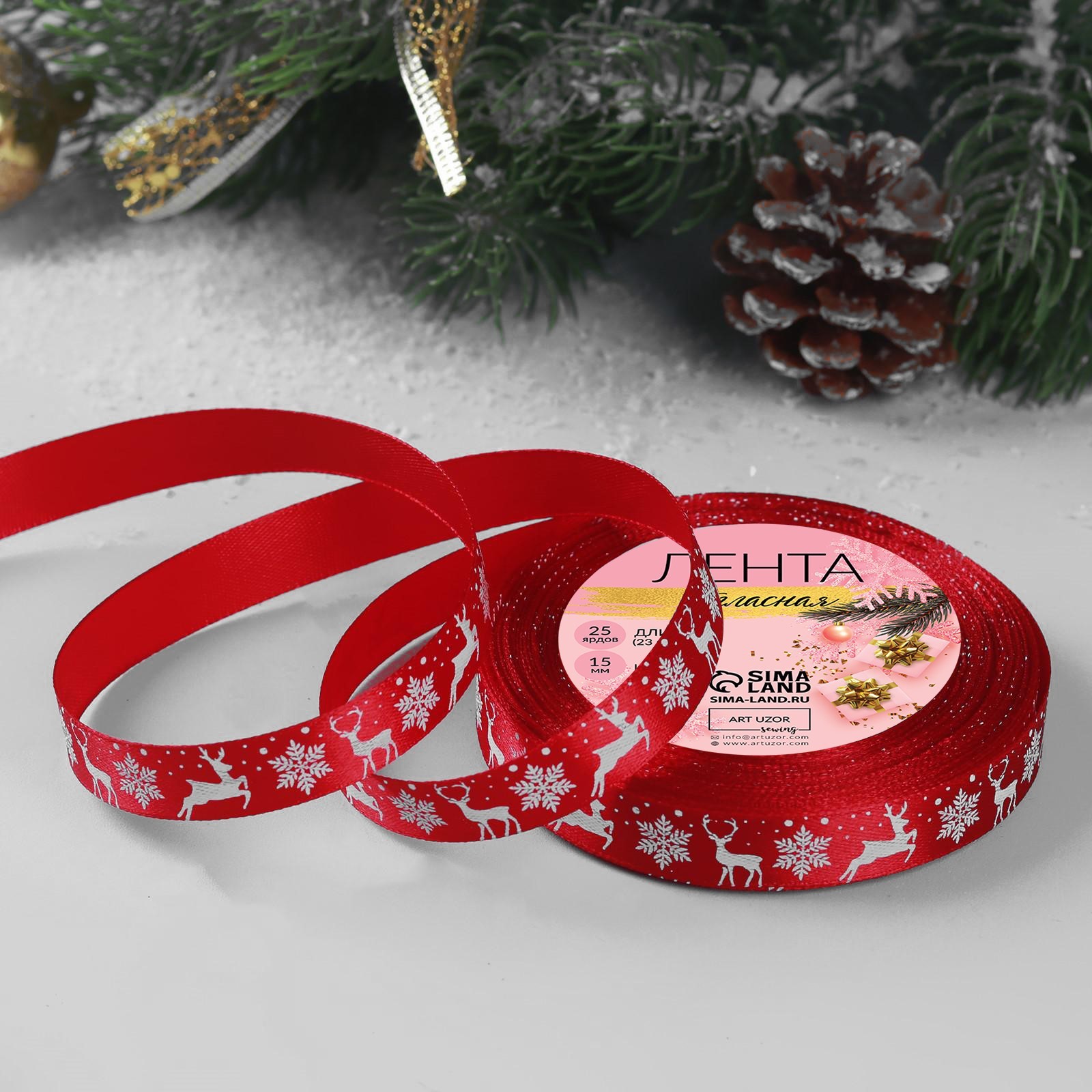 Лента атласная 15мм*25мм новогодняя Олени №33 красный 3557569 - Dolphin HoReCa